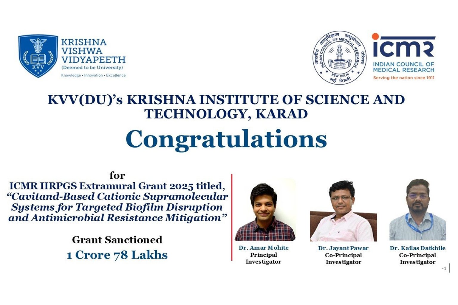 Krishna Institute of Science and Technology,under Krishna Vishwa Vidyapeeth, has achieved a significant research milestone with Dr. Amar Mohite, Assistant Professor, securing a prestigious ICMR IIRPGS Extramural Research Grant 2025 worth ₹1.78 Crore from the Indian Council of Medical Research. About the Research Project The sanctioned research project is titled: “Cavitand-Based Cationic Supramolecular Systems for […]