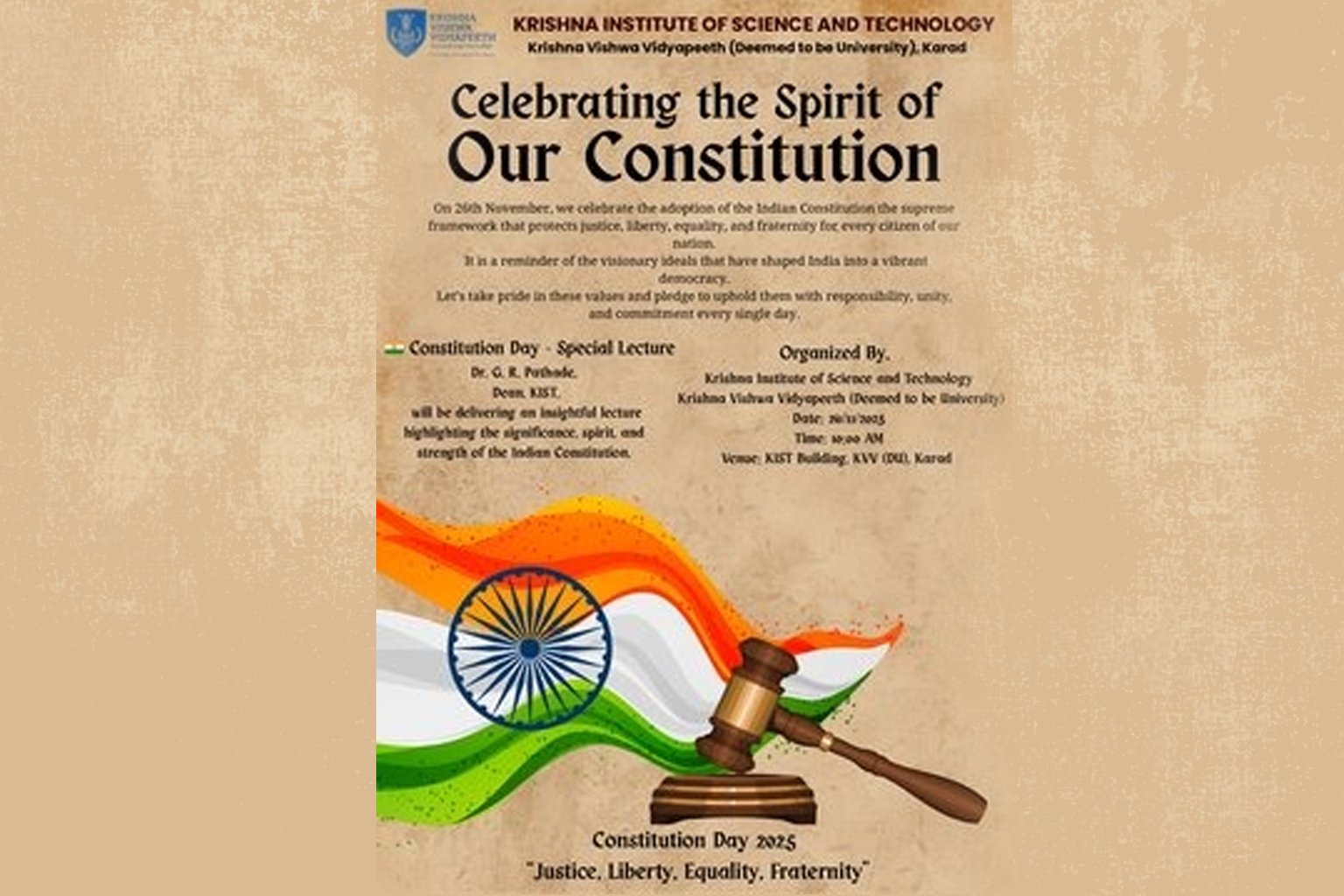 Krishna Institute of Science and Technology, under Krishna Vishwa Vidyapeeth, observed Constitution Day on 26 November 2025 by organising a special lecture aimed at highlighting the core spirit and contemporary relevance of the Indian Constitution. The programme commenced at 10:00 AM in the KIST Seminar Hall, where Dr. G. R. Pathade, Dean, KIST, delivered an […]