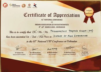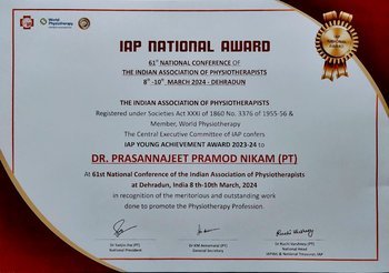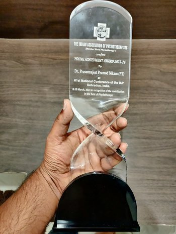 Dr. Prasannajeet Pramod Nikam, Assistant Professor in the Department of Sports Physiotherapy, has been honored with the prestigious “I.A.P Young Achievement Award” (National Award) at the 61st IAP National Conference held in Dehradun, Uttarakhand. He received this recognition for his outstanding contribution to advancing the physiotherapy profession through innovation and research.